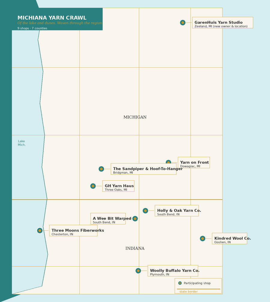 The Michiana Yarn Crawl spans two states, seven counties, and nine independent yarn shops — from the Lake Michigan shoreline east through the dunes and into the heart of Michiana. Follow the trail to discover local fiber arts makers, rare yarns, and the community woven through this region.
